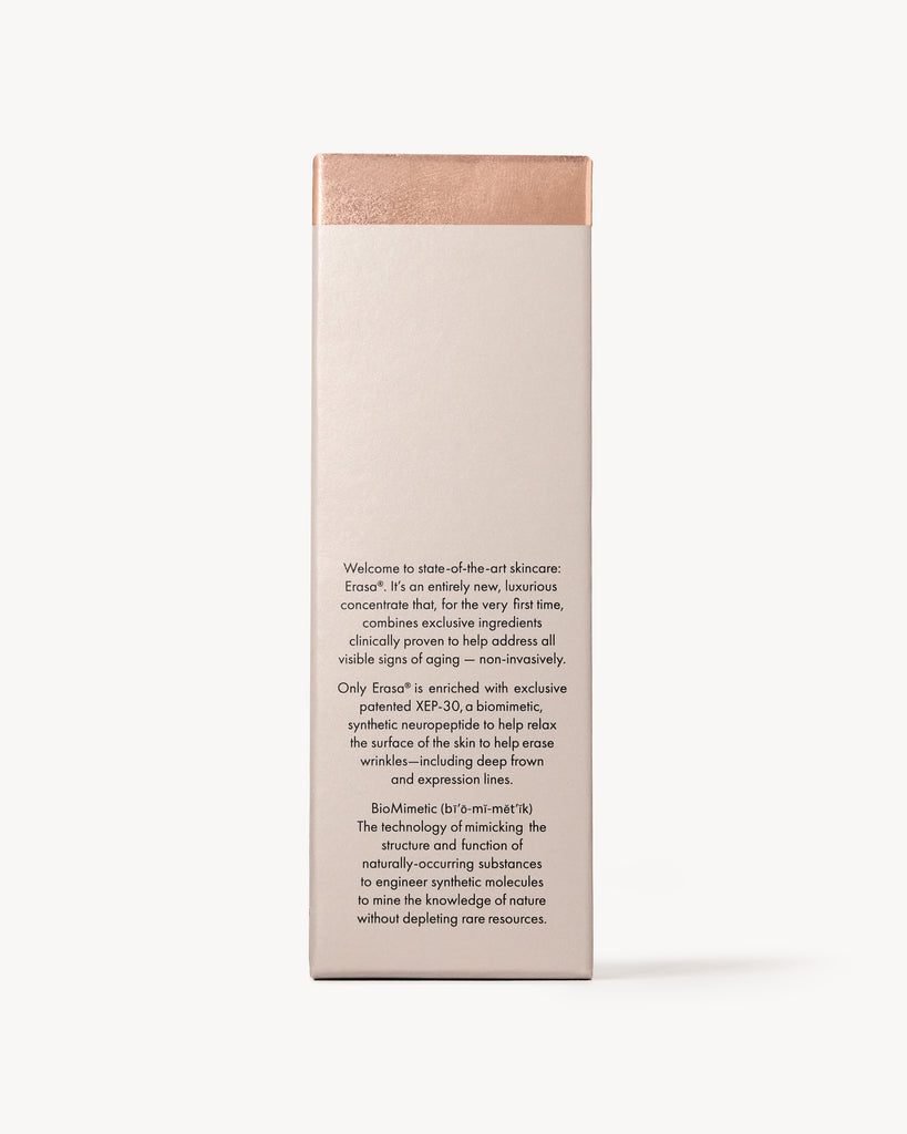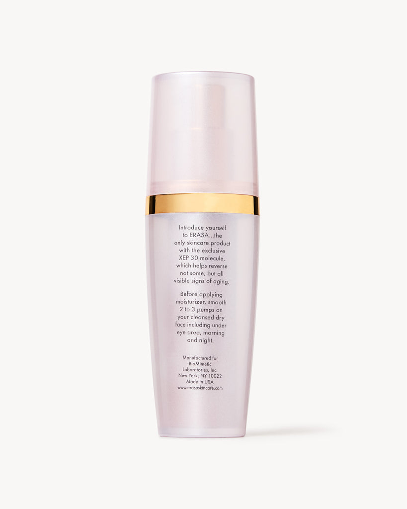 For best results, apply Erasa to clean, dry skin in the A.M. and P.M. as the first step in your usual skincare routine. Dispense a small amount (2 to 3 pumps) onto your fingertips and quickly blend a thin, even layer over the entire face and under eyes. Wait a few seconds before applying additional products. In the A.M. follow with an SPF moisturizer to help maintain your newly younger looking skin. Before bed follow with night cream. Can be used on neck and décolletage as well.